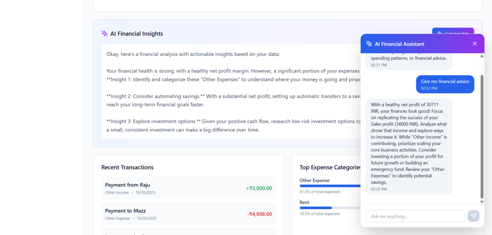 Experience the world's most intelligent personal finance app. Just input your transaction and let our powerful AI do the rest. It doesn't just categorize (income/expense); it instantly enriches the data with an accurate description and category, adding it directly to your central "Transactions" ledger. Beyond basic tracking, the app provides an up-to-the-minute view of your P&L (Profit and Loss). Unlock a wealth of knowledge with the one-button AI Insights feature that analyzes your patterns and gives you actionable financial advice. Need specific advice? Your integrated AI Finance Coach is available 24/7 to answer your toughest money questions.